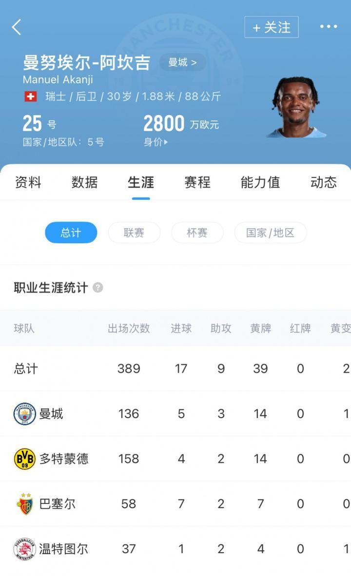 现年30岁的阿坎吉本赛季尚未获得任何一次出场机会,他与曼城的合同还剩两年,目前他的德转身价为2800万欧。自2022年以2000万欧转会费从多特加盟曼城以来,阿坎吉已经代表曼城出战了136场比赛。